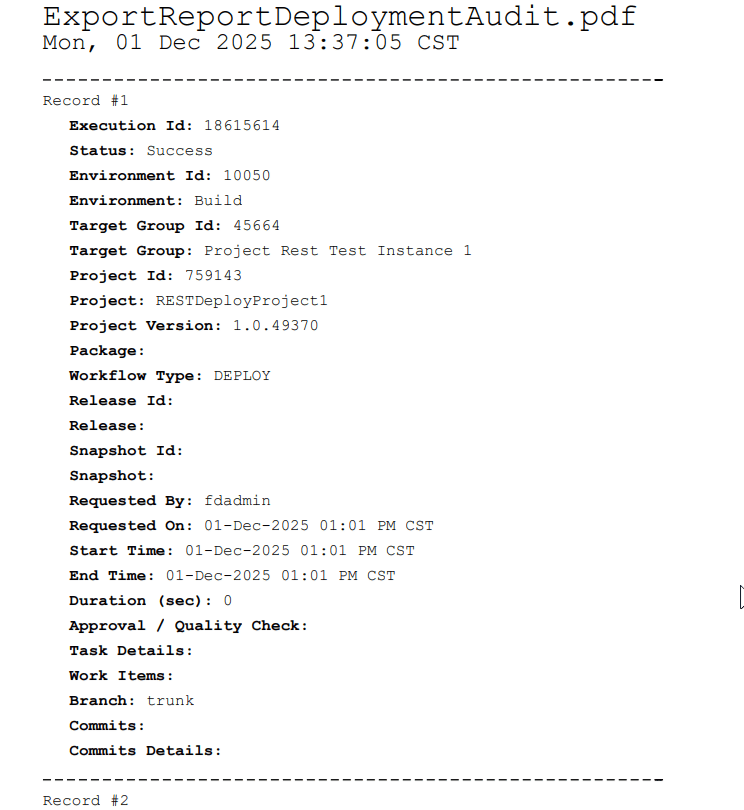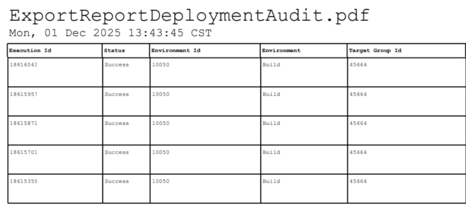 FlexDeploy 10.0 provides three export formats for Deployment Audit Reports, making it easier to share, archive, and analyze deployment data. The data can be exported as a PDF Table, PDF Record, or CSV. All three formats are ideal for: